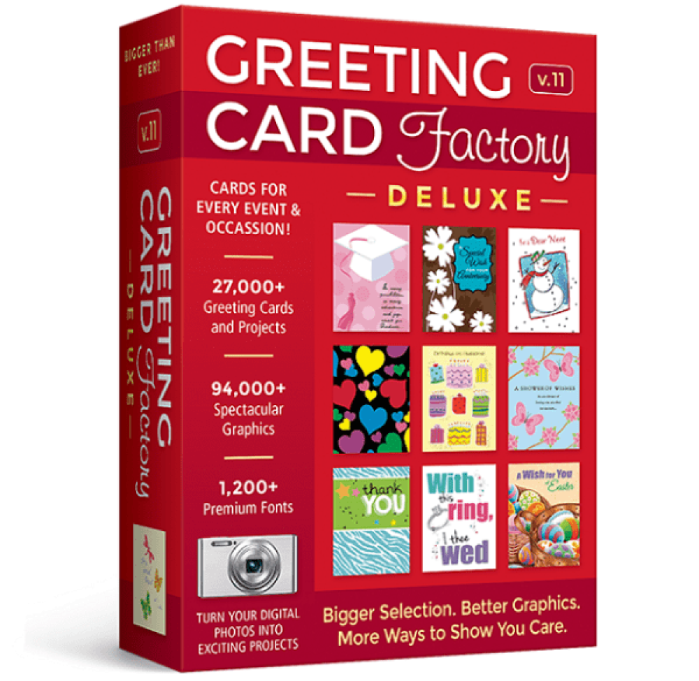 Bigger selection * Better graphics * More ways to show you care Customize! Create greeting cards, calendars, photo projects and more 27,000+ Cards and projects 94,000+ Graphics Easy! Complete projects in 3 easy steps Included! Advanced photo editor Customize, personalize and send the very best store-bought greeting cards with one great software product - Greeting Card Factory Deluxe 11! This new version contains the ultimate collection of retail-quality cards for every event and occasion. With beautiful graphics, text effects and heartfelt sentiments to choose from, you'll create greeting cards that not only look incredible but express your innermost feelings every time. Plus, Greeting Card Factory Deluxe 11 offers more than just cards. Increased content, contemporary new features, an easier to use interface and enhanced browser system let you search for other customizable projects like invitations, thank you notes, stationary, envelopes and more! Even correct and add your own digital photos to cards, calendars and crafts using the Advanced Digital Photo Editor. Create the best in personalized greetings with 27,000 cards & projects and 94, 000 graphics in the new Greeting Card FactoryDeluxe 11 today! 26,500+ Cards to Choose From Creative Projects, Photo Projects & More Delight Family & Friends with Photo Calendars Now you can easily create custom daily, weekly, monthly and annual calendars using dozens of professionally-designed templates. Then add your own digital photos to create one-of-a-kind gifts! Greeting Cards Invitations Photo Cards Thank You Notes Stationery Envelopes Note Cards Labels & Stickers Photo Projects Web Projects Custom Photo Calendars Gift Tags Email Greetings Photo CD Greeting Cards Pop-Up Cards Certificates Crafts Advanced Photo Editor System Requirements Windows 11, 10, 8, 7, Vista or XP 512 MB RAM Pentium III 800Mhz or Faster DVD Drive Recordable or rewritable CD Drive required to burn CD greeting cards